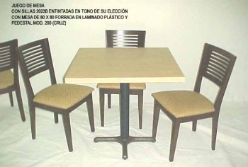 Juego de Mesa con sillas modelo 2026b entintadas en tono de su elecci�n, tapizadas en tela 100% acr�lico o vinil (colores lisos a elegir) y cubierta de 80 x 80 forrada en un solo tono de laminado pl�stico Rexcel o Ralph Wilson y pedestal modelo 200 (cruz) en acabado electrost�tico color negro, gris-plata � chocolate